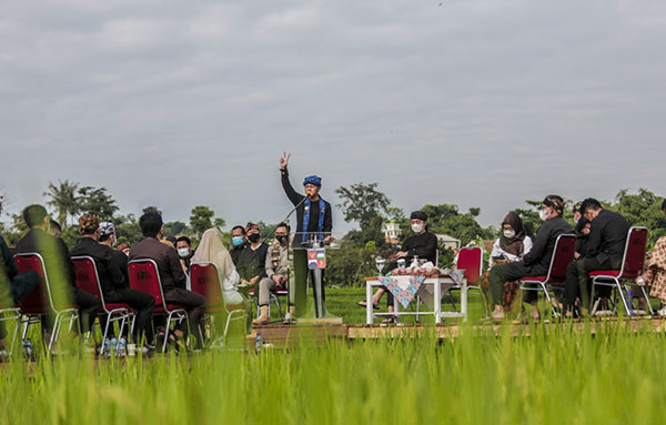 Evaluasi pencapaian kinerja di 2020 dan akselerasi rencana program Pemkot Bogor 2021, dibahas Wali Kota Bogor Bima Arya di tengah sawah kawasan Ciharashas, Mulyaharja, Bogor Selatan, Rabu (6/1/2021). Rapat dihadiri pejabat Organisasi Perangkat Daerah (OPD).